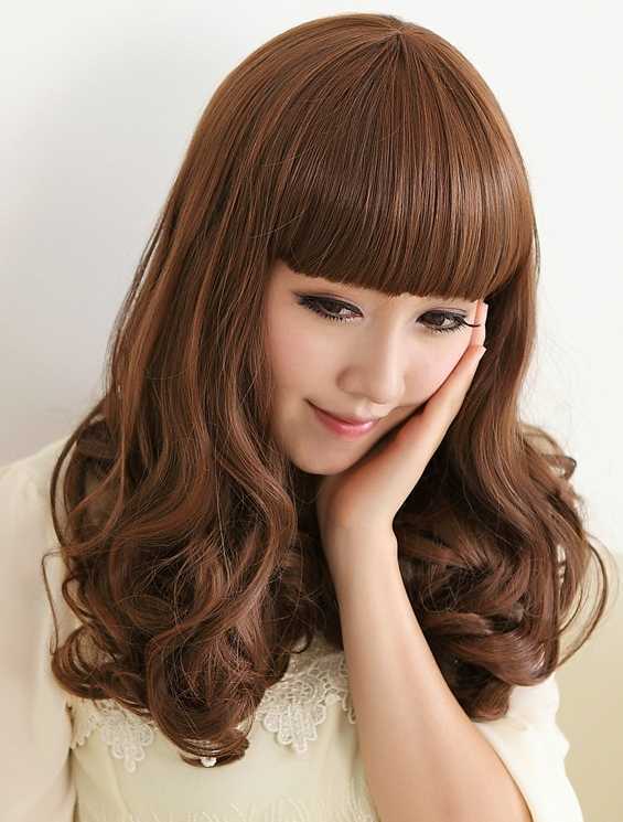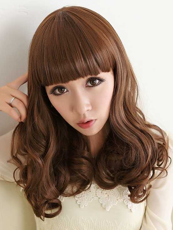 额头宽的MM可以试试这款齐刘海卷发,既然是额头宽那就不妨试试把宽额头遮起来,齐刘海遮住宽额头,两颊的内卷发,内扣贴着脸蛋,轻松打造了小脸效果,好甜美。