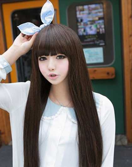 齐刘海用来遮宽额头,而且还可以添几分可爱哦,用厚重的长直发加强可爱感,显得清纯可爱哦,而且这样也可以打造小脸效果。
