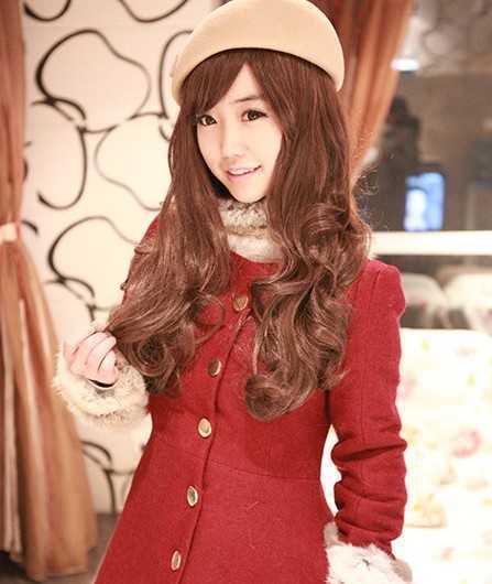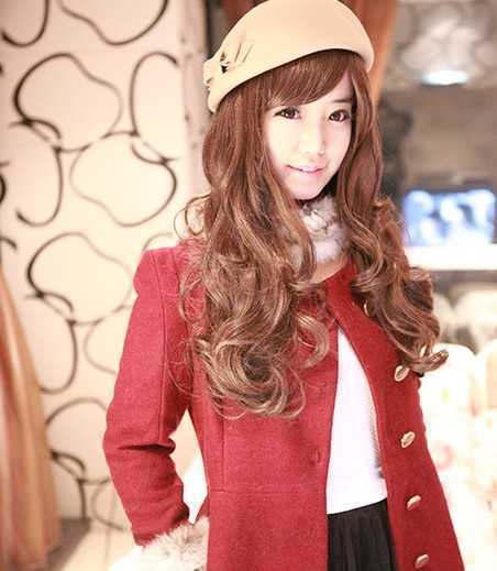 栗色的发色真的很时尚潮流哦!斜刘海的打造不仅有着很好的修脸效果,还很甜美哦!两颊长卷发尾很自然的披搭在肩上,特别有味道哦!