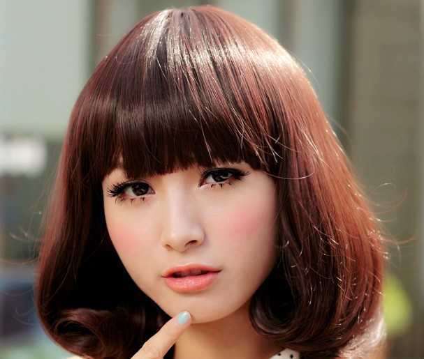 前面剪齐的刘海,看上去是不是觉得很甜美可爱呢?染成棕红的发色,更是增添了潮流气息,更是衬托出白皙肌肤,两全其美,内扣又带点蓬松的发尾,修脸最佳!俏皮又显活泼,长脸型的妹子试试!
