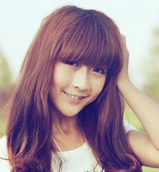非常唯美感的中长发型,将女生甜美清纯之处作了很好的铺垫,微斜弧度感的齐刘海恰到好处的长度完美的修饰了长脸型,呈现出一张精致小巧的巴掌脸效果,深棕发色又是时尚的标志。
