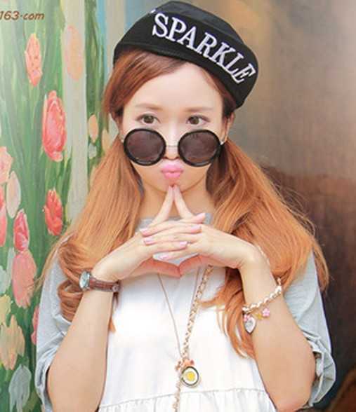 咖啡色的染发起到很好的吸睛效果,双扎的马尾发束,又给人耳目一新的可爱俏皮感,偏分的刘海在时尚帽子的装饰下,完美掩盖了额头窄的不足,复古的墨镜,嘟嘴的小动作,小女生潮流而开全展现。