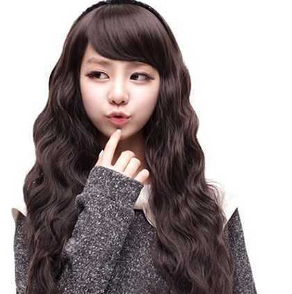这款韩式长卷发发型,斜开的刘海最显甜美,自然黑发色,更给人一种不做作的feel,蓬松的大波浪,搭在肩上,修颜减龄。