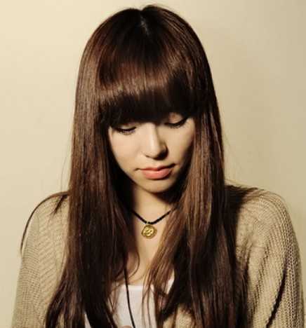 这款齐刘海长直发,甜美乖巧,金属感的染发时尚个性,更显肤色,长长的直发搭在肩上,好美哦!修颜更显气质,圆脸妹子适合哦!