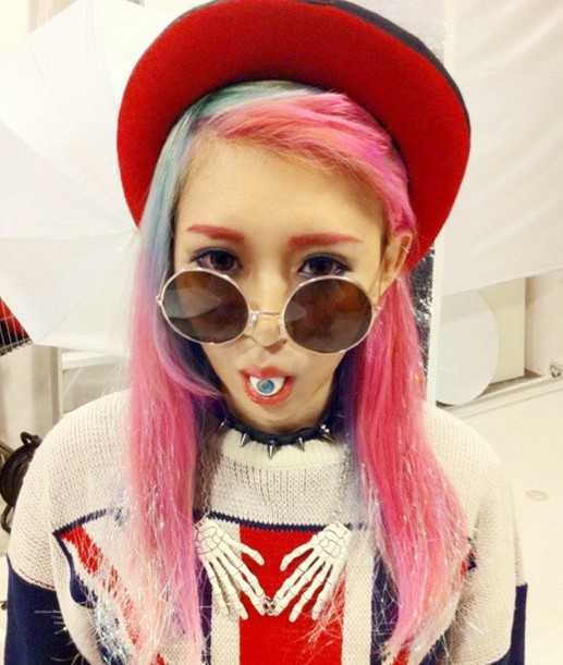 超精致瓜子脸的女生,顶着一款2014超炫酷潮流的中长发型,粉色和淡绿色的挑染发色,搭配墨镜和帽子,帅气时尚极了!