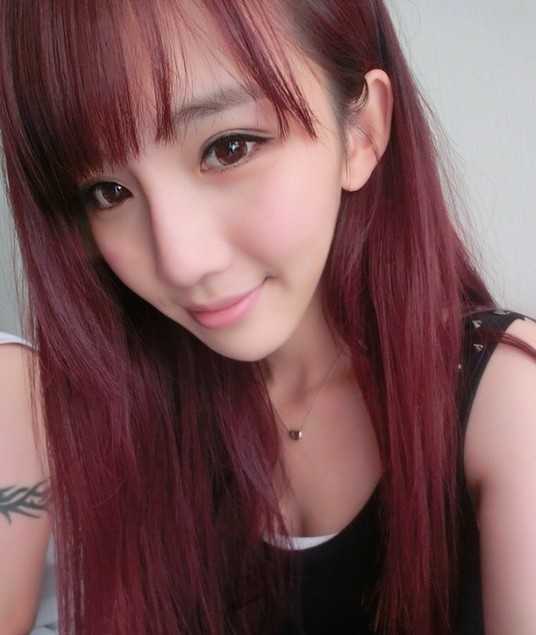 十分养眼时尚的酒红染发色,在长长的直发发型演绎下,恬静气质十足!稀薄修剪的碎直刘海,对大圆脸来说也很是修颜,让整体造型好看极了。