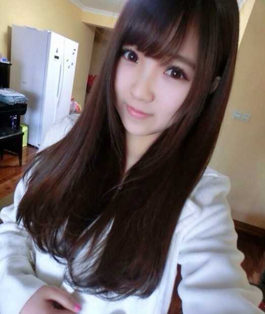 齐尾修剪的长发发型,完美塑造乖乖女的温柔形象,稀薄的碎斜刘海和两侧发髻,起到了超瘦脸的功效,对于大胖脸的妹子来说那绝对合适又时尚。