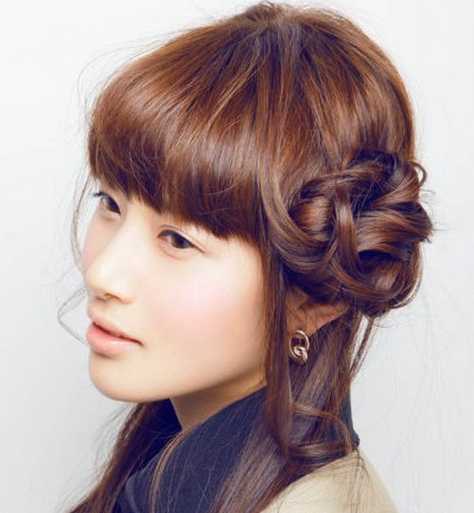 神秘又性感的深棕色将发型变得有光泽度,侧扎的花苞头,体现小女人的气质感,而内扣齐刘海的减龄效果也大大甜美加分了,小脸女生不错的发型选择哦。
