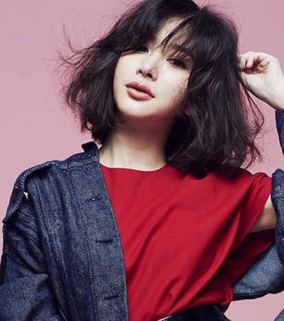 蓬松、凌乱的中长烫卷发,两颊的蓬松感很好修饰了宽脸MM,性感的妆容凸显出女人味,时尚修颜的发型。