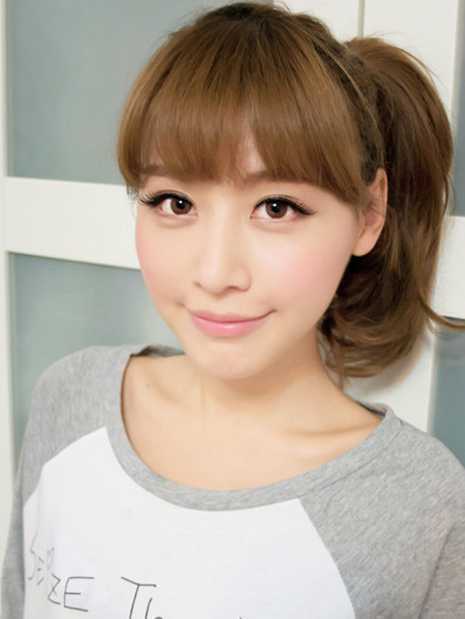 圆脸不怕扎发发型,像这样的简单马尾扎发,只是搭配齐刘海的设计,既能修饰脸型外,还起到十分减龄功效,粉嫩的美妆点缀,甜美迷人极了。
