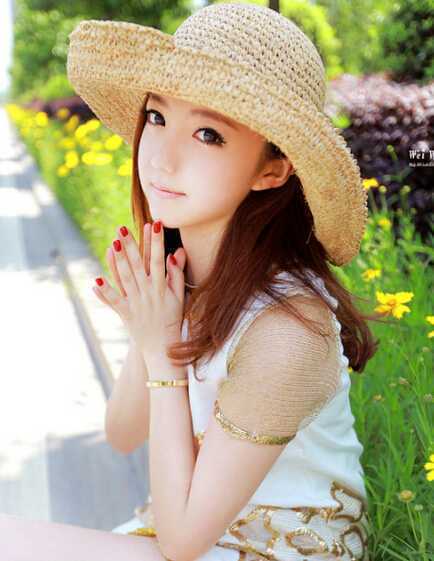 棕黄发色的中长发发型,简约又显得清爽美感,编织帽子和连衣裙的装扮,很有夏日甜美清新气息,这样的小脸女生看起来是不是相当好看呢?