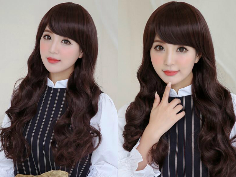 略偏分的齐刘海设计时尚而有个性,修脸长脸型的效果非常好,深棕色的长卷发丰盈饱满,给人充满活力的感觉,还有助提升你的女人味。