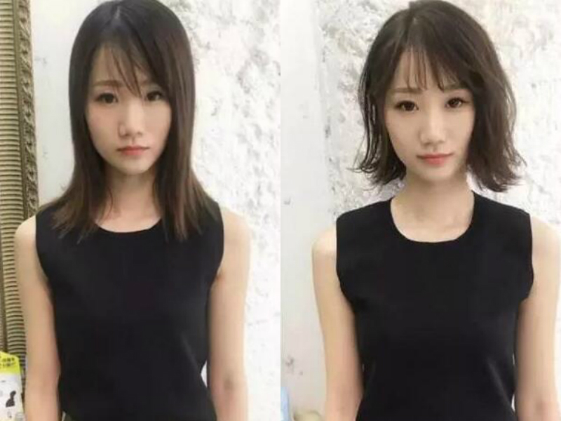 看到这个对比图,小编不禁要提醒妹子们了,头发少或细的妹子最好不要轻易留长直发,因为紧贴头皮的头发会让你的头和脸看起来都很大哦!把齐肩的直发剪到耳下并把发尾烫出外翘的效果,不经意就增添了俏皮感,烫过的头发蓬蓬的垂于耳朵两边,使脸型看起来小了很多,齐眉的空气刘海使额头若隐若现,也又效的缩短了脸型长度,真是款一举两得的发型呀!
