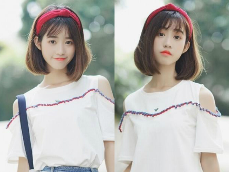 同是一款短发发型,刘海稍微三七分后一侧长刘海从头上倾斜而下,刚好遮住颧骨并且使脸型线条变得柔美不少,本应露出额头的地方却修剪出一层刘海,加上齐脖的发尾内扣处理,就更加显得脸型完美了,菱形脸秒变鹅蛋脸。