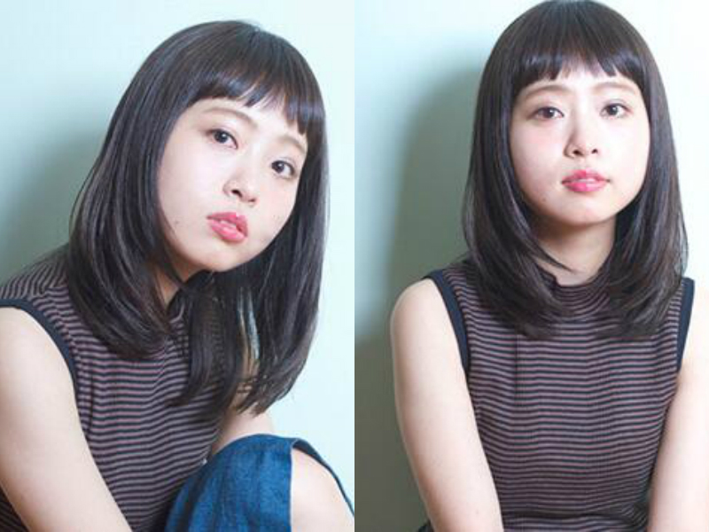 虽然刘海有修颜显瘦的效果,但脸宽的妹子小编是不建议留齐刘海的,因为完全遮住额头会更突出下部分的宽脸,而像这样不过眉的刘海倒可以。刘海修剪的稍微有点弧度,与两侧头发重合弱化宽脸的线条,露出眉眼更突出妹子有神的双眼和精致的五官,发尾的修剪对修饰脸型更是起到关键作用,内扣的弧度呈现收拢形状,轻松的便让脸型缩小了不少。