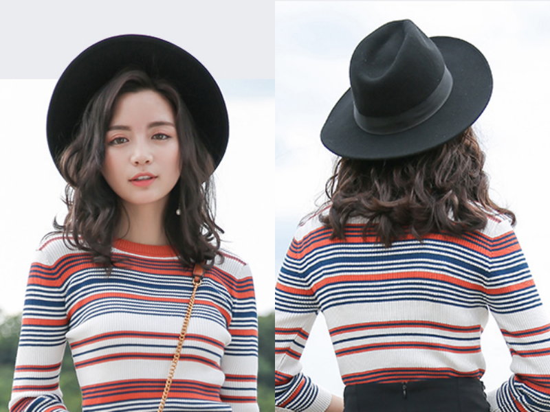 不对称的刘海可以修饰脸蛋,使五官看起来更为精致,起到了一个塑颜的效果,比较适合鹅蛋脸的妹子哦。凌乱的中长烫发增强了空气感衬托出脸部线条的柔美,深棕色的秀发与黑色帽子在色觉上营造出层次,透露出一阵阵的随性,让你走在哪里都能令人眼前一亮。