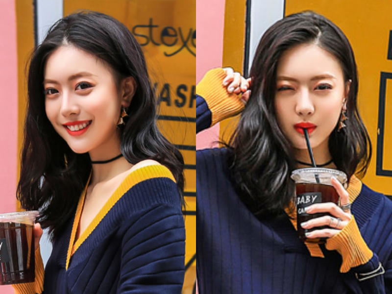 自然的黑色秀发经典又耐看,加上偏分的刘海搭配柔顺的中长烫发,很好地衬托出漂亮的鹅蛋脸,两边内扣的头发牵引着人们把注意力放在五官上,再不经意地弄出俏皮的表情,显得更加可爱。