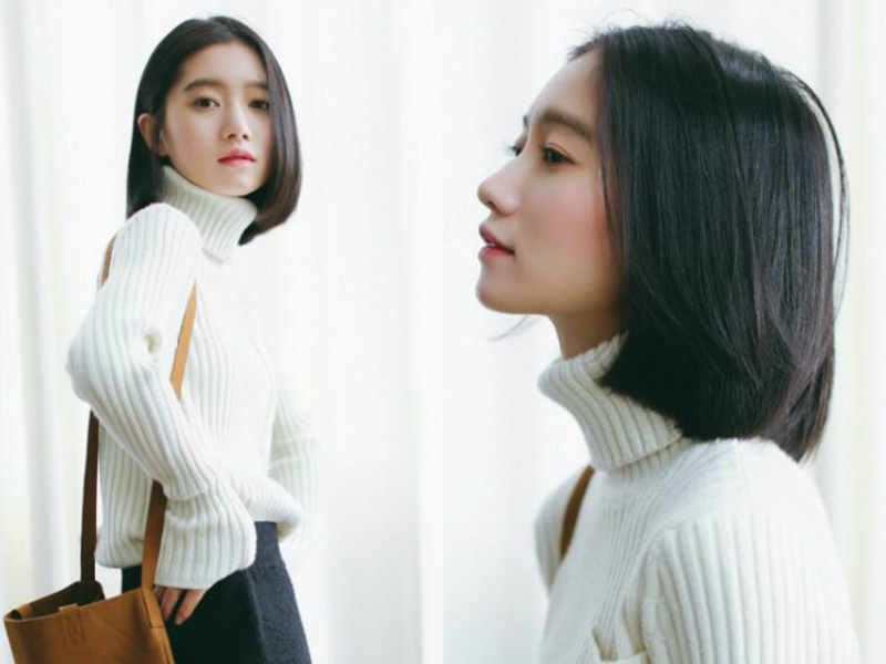 偏分的刘海设计本就比较修颜,再加上妹子巴掌般的小脸,则显得愈发动人了。顺直的发丝贴着脸颊滑下,发丝的直线线条不经意间拉长脸型,修剪细碎的发尾垂散在肩前,加上亚麻棕色的发色,看起来利落又时尚。