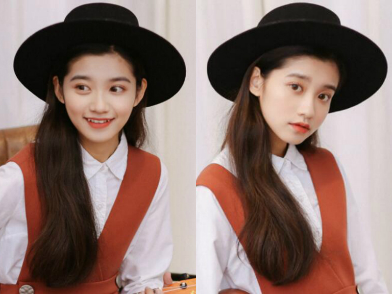 栗色的长发蓬松柔软,自然垂下很好的修饰出完美的侧颜,三七分的刘海露出光洁的额头让圆脸变成鹅蛋脸,让穿着背带裙的妹子非常清纯很有文艺范。