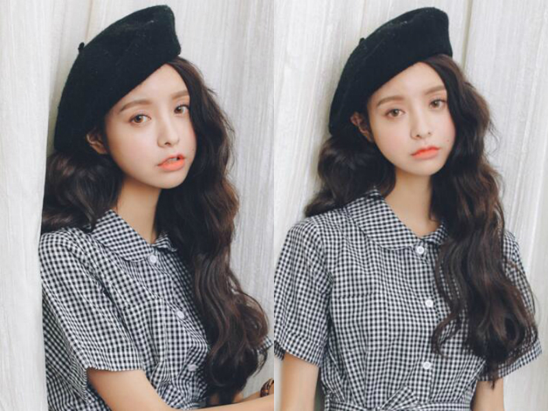 长发带点慵懒蓬松的大卷,三七分的刘海遮住部分额头修饰成精致的鹅蛋脸,一头黑色的发,乌黑靓丽,穿上格子裙,戴上帽子,很有复古优雅的气质。
