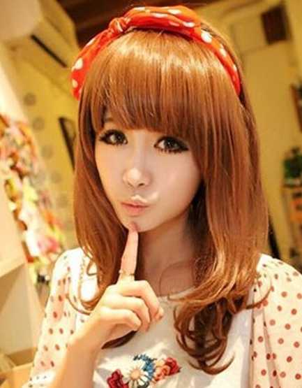 可爱版的梨花头,黄棕的发色,美美的发饰,一个卖萌的表情,超甜美可爱哦,缝隙的齐刘海,添了甜美感,非常可爱哦。