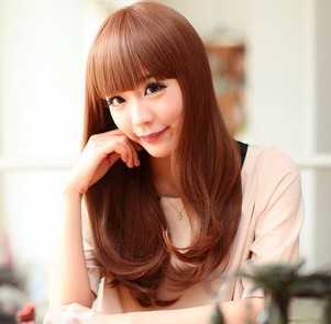 2、蜜糖棕齐刘海中长梨花头发型