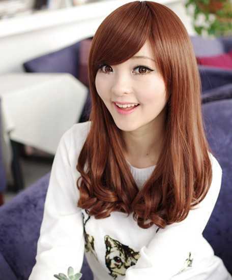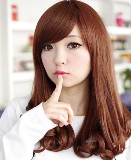 斜刘海的梨花头,不仅起到了修脸效果,厚重的刘海更是衬托着好看,两颊卷发尾显得很自然,红棕的发色在2013年很流行哦!