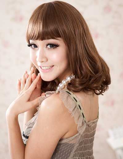 一头浅棕的发色能衬托出白皙肌肤,前面齐刘海设计,稍作卖萌表情,足够可爱甜美。两颊带点蓬松感的内卷发尾,修饰了脸型,很棒!