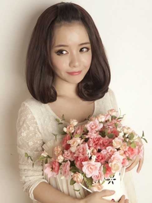 2013时尚流行的梨花头发型,将前面的刘海往后梳起,露出光洁的额头,很清新,内卷扣发尾,展现出俏皮感,还很好修饰了脸型。
