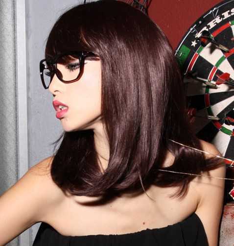 深棕发色,显得十分时尚,斜刘海,两颊内扣发尾,瘦脸效果相当不错!还很减龄哟!美眉喜欢么?