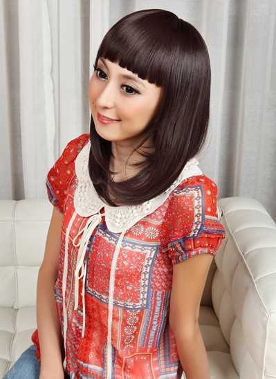 前面是剪齐的刘海,中长款,内扣又有层次感的发尾,对修脸效果很好,瘦脸又减龄。栗棕发色,更很好将你白皙肌肤呈现。