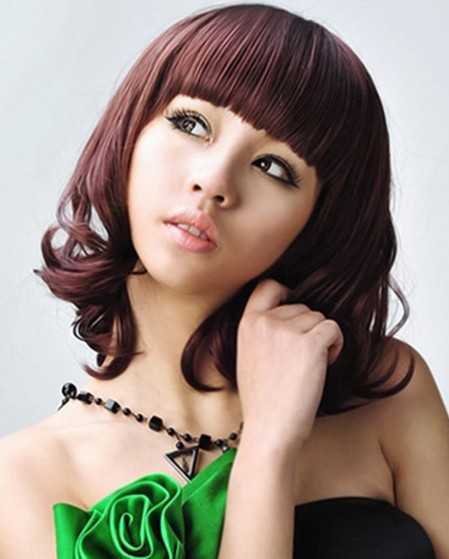 一头酒红的发色,衬托出白皙肌肤,剪齐的刘海,展现甜美范,卷卷的发尾搭在肩上,修饰了脸型,十分减龄的发型哦!好美!