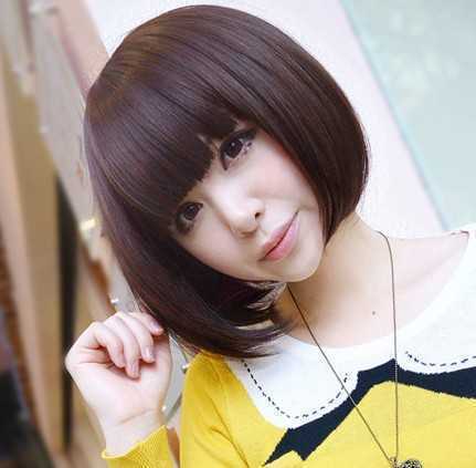 可爱感十足的短发梨花头,啡棕发色,展现出潮流气息,碎齐刘海,更显出甜美范,内扣感发尾,修脸效果最棒!轻熟女大爱,顶着它尽显俏丽感!