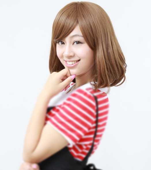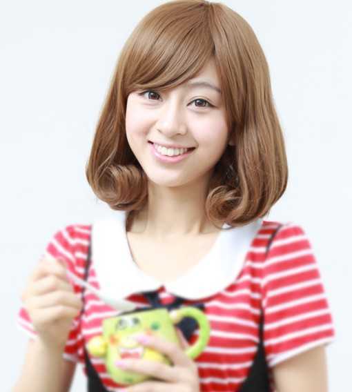 斜开的刘海,显得甜美十足,两颊卷扣的发尾,不仅能起到修脸瘦脸效果,还十分减龄哦!拒绝胖脸、宽脸,浅棕发色,白色肌肤展现!
