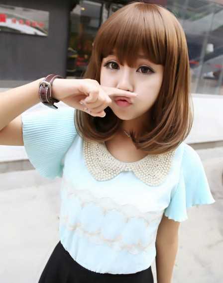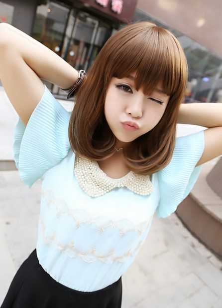 镜头前卖萌一下,可爱、甜美!随意修剪的刘海,甜美感十足,加上棕黄发色,看上去是不是很添时尚感?有木有?