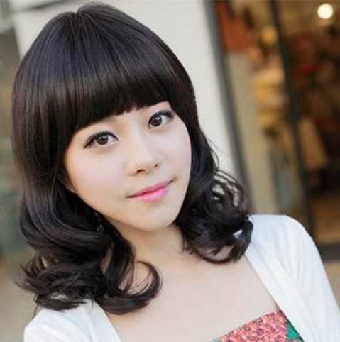 齐刘海不仅可以修饰长脸型,还能让你变得更加甜美年轻,齐肩小卷,层次明显,造型立体,搭配深色的染发,散发出低调的奢华,又不失青春淑女的感觉。