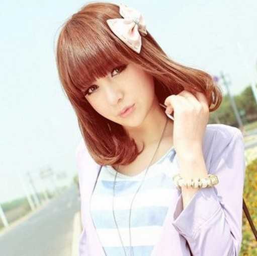 棕黄染色的短发梨花头,唯美的环境下气质十分优雅,发尾采用内卷的设计,让整个发型看起来自然大方,整齐的刘海凸显大眼睛效果,蝴蝶结的发饰点缀,甜美可爱的气息又能很好散发着。