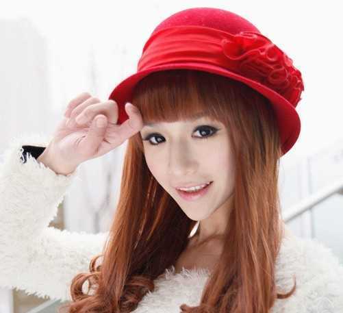 时尚的蜜糖色系染发,给人超舒适甜美感觉,两侧的头发中采用梨花烫的效果,更是亮丽又显得无敌迷人,整齐的刘海瞬间飙升甜美度,红色帽子的装点下,优雅小妩媚哦!