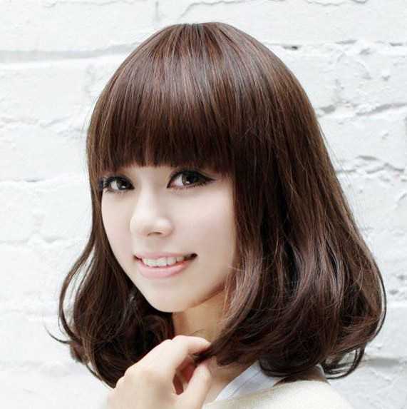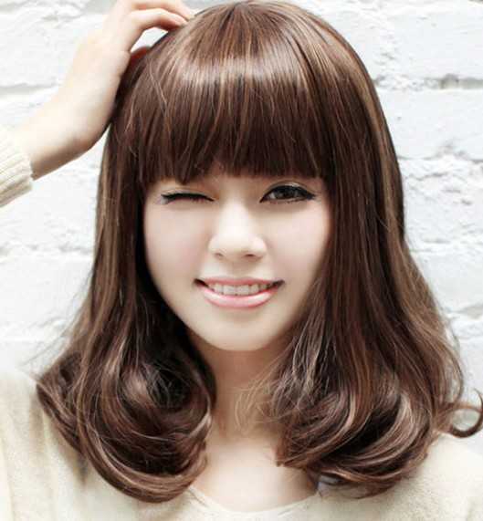 前面是剪齐的刘海,看上去就是有种甜美的feel!深棕染发颜色,倍添潮感,内卷扣的烫发尾,最能修饰妹子的脸蛋咯!