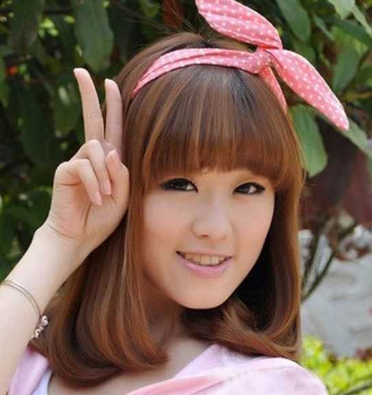 可爱的梨花头发型用来扮嫩也是不错的效果哦,厚重感的齐刘海,内扣的发尾,然后再搭配一个波点的蝴蝶结头巾,立马让你变得甜美可爱的。