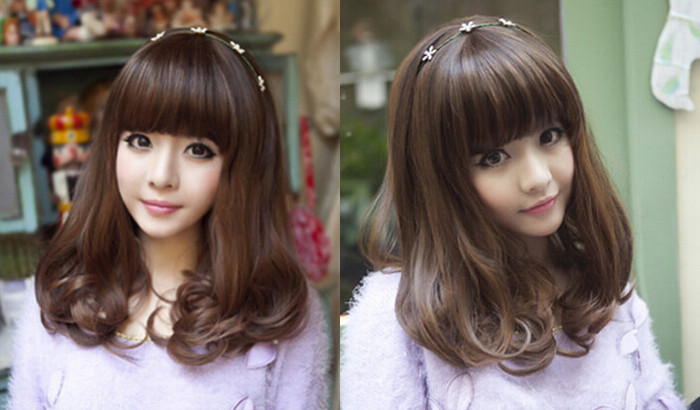 轻薄服帖的齐刘海再配上内扣式梨花头,增添了青春文静的感觉。亚麻色的染发和梨花头造型相互相成,更显时尚自然,集修颜与甜美为一体。