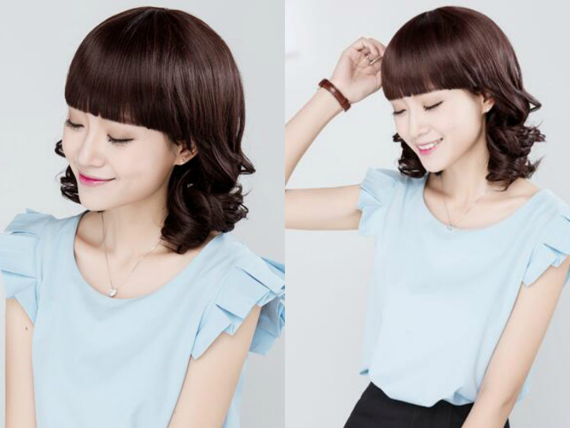 内扣式齐肩梨花头本就自带时尚靓丽光芒,修脸效果更是不在话下,想更显甜美减龄,那么你可以剪一个齐刘海,那就保证谁都不及你萌了。