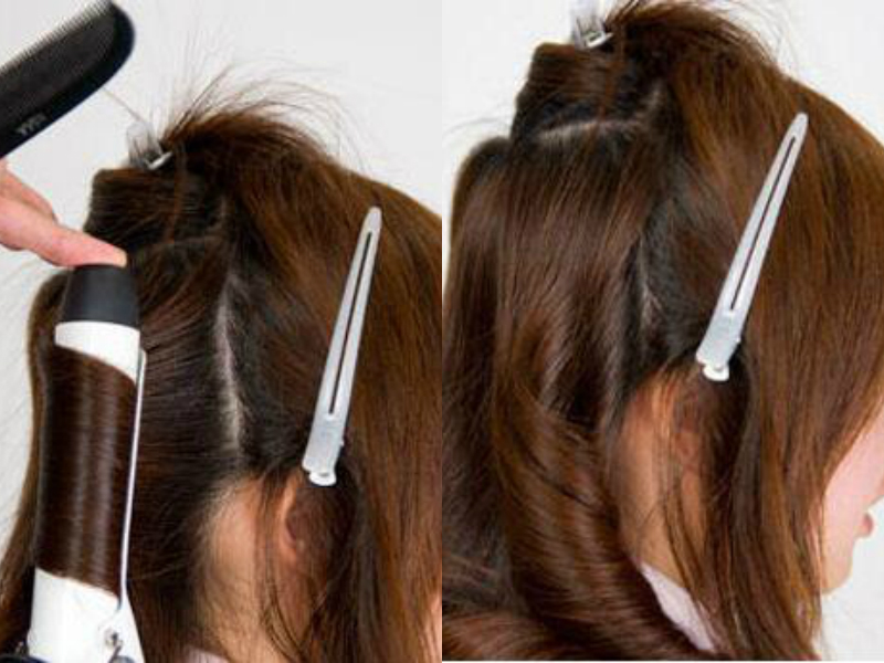 首先,我们需要按照图示将头发分成上下两层,使用卷发棒先对顶部的头发进行烫卷。