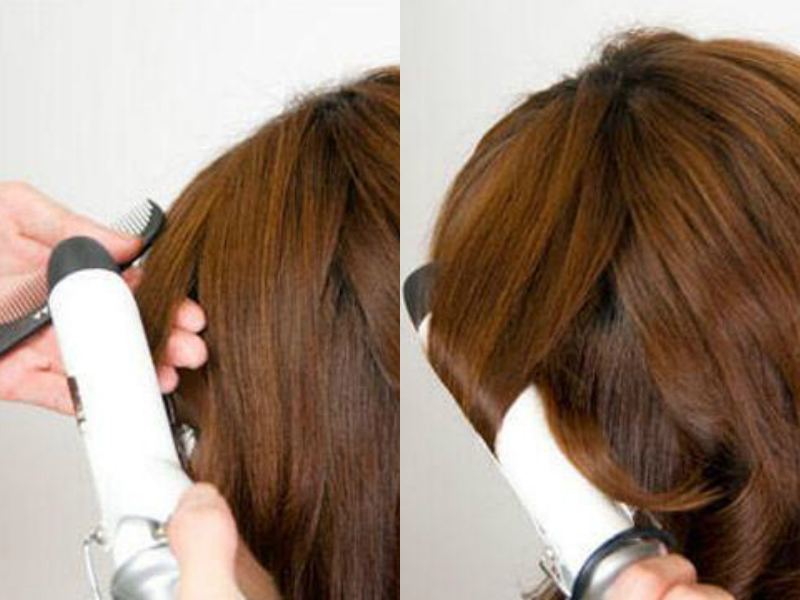 然后开始卷烫左、右两侧的头发,都是从头发中部开始卷烫,让发型更有层次感。