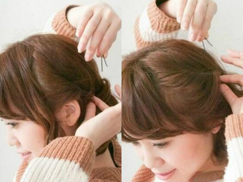 先将靠后的一部分头发旋转成发束,略微卷起,拉向耳后,使用发夹固定好。接着同样将前部分的头发先旋转后卷起,置于刚才的发束上,使用发夹固定好。