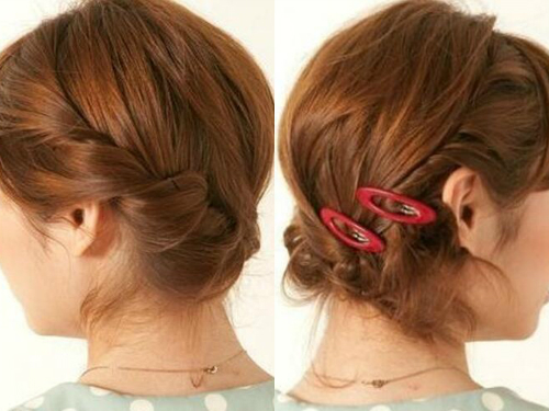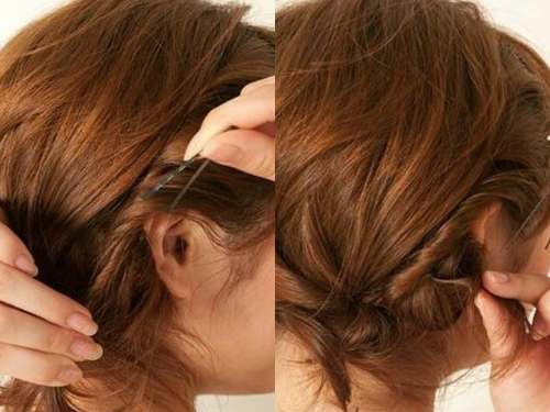 按照同样的方法将另一侧余下的头发也旋转成发束,与刚才的发束固定在一起,藏好发尾。