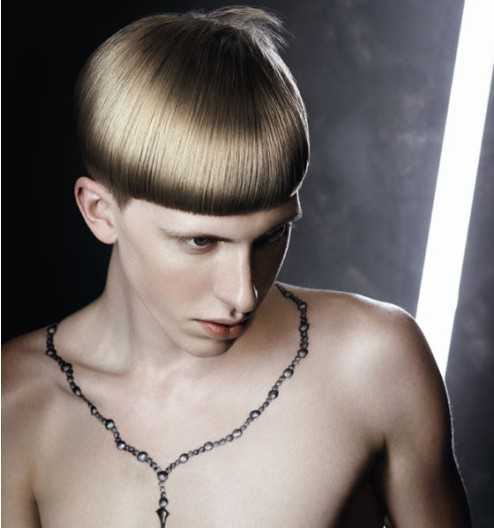 金黄金黄的蘑菇头,弧形的造型,就像半个西瓜盖在头顶上一般,很前卫,很有趣味的一款弧形刘海。