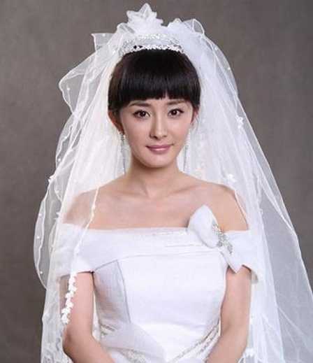 杨幂的这款新娘发型,齐齐的刘海,很适合她这种脸型稍长的新娘哦,头上的发饰搭配着发型美极了。