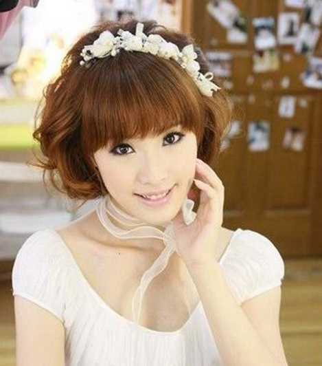 梨花头短发新娘,很美哦,两侧的梨花卷有点俏皮的感觉,发饰增添了不少美感哦,给人一种浪漫唯美的感觉,好好看的一款齐刘海短发发型。
