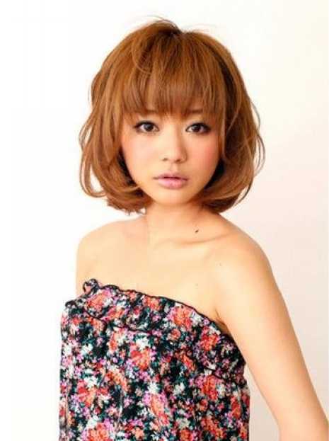 梨花头感觉,碎碎的齐刘海,蓬松的梨花头,两颊向内卷的头发,修饰脸型的效果很捧哦,棕黄的发色,时尚感十足哦,不错。
